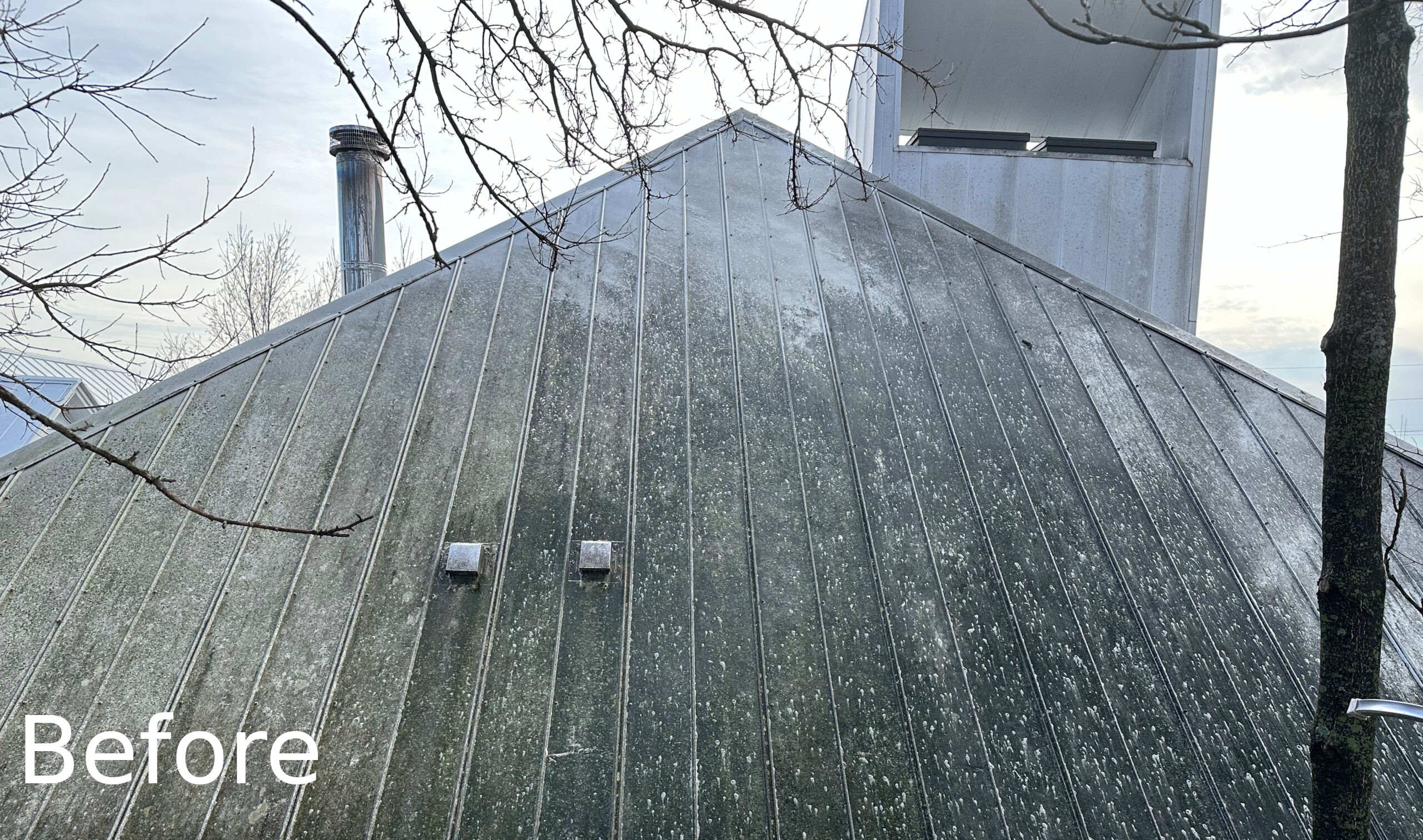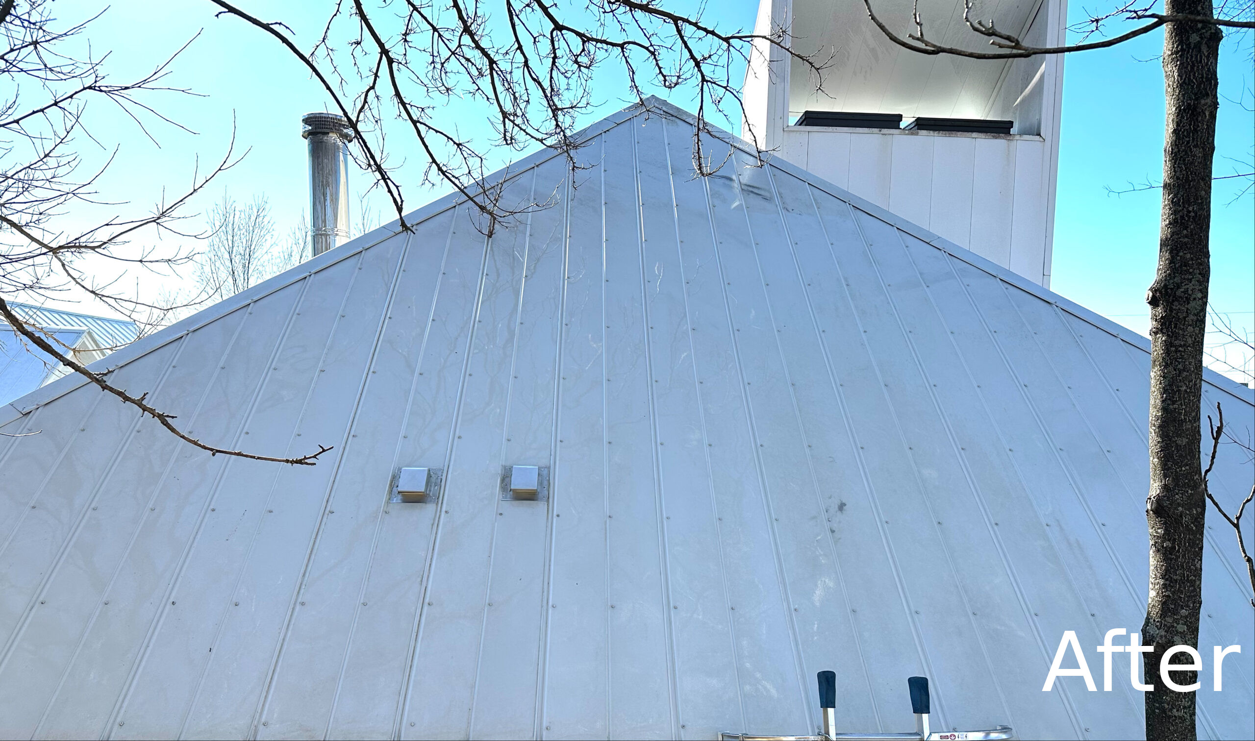 Before and after soft washing a galvanized white metal roof on one of the Ghost Houses in North Knoxville. This low-pressure roof cleaning method safely removed algae, mildew, dirt, and organic buildup, restoring the bright white finish while protecting the structure’s historic, bungalow-inspired design.